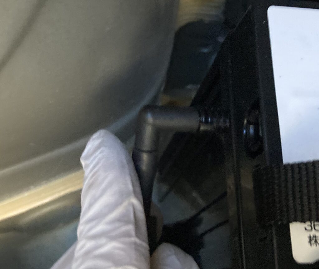補器バッテリーは車内に設置されているため、バッテリー充電時に発生するガスを社外に抜くためのホースが接続されています。