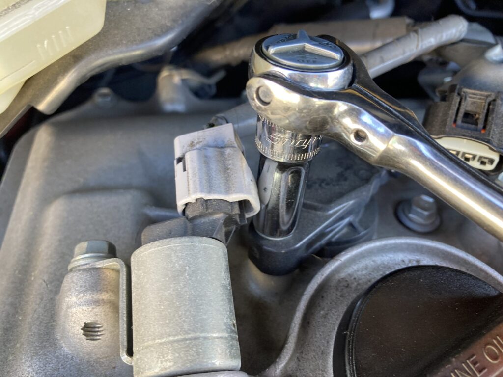 下の画像を見ていただければわかりますが、ソケットがOCV(オイルコントロールバルブ)のコネクタに当たっています。このまま回して外すことも可能ですが、劣化具合と当たり方によっては破損し交換になってしまう場合があります。